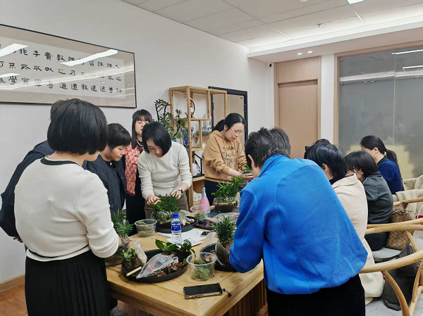 隨后的苔蘚微景觀DIY環(huán)節(jié)充滿創(chuàng)意與趣味,工作人員提前準(zhǔn)備了花盆、苔蘚、綠植、土壤、小石子、噴水壺等材料,大家認(rèn)真鋪設(shè)底土、種植綠植、擺放裝飾,將小巧的玻璃盆化作承載自然與詩意的微縮世界。大家一邊制作一邊交流,歡聲笑語不斷,在動手實(shí)踐中釋放壓力,在協(xié)作互動中增進(jìn)情誼。